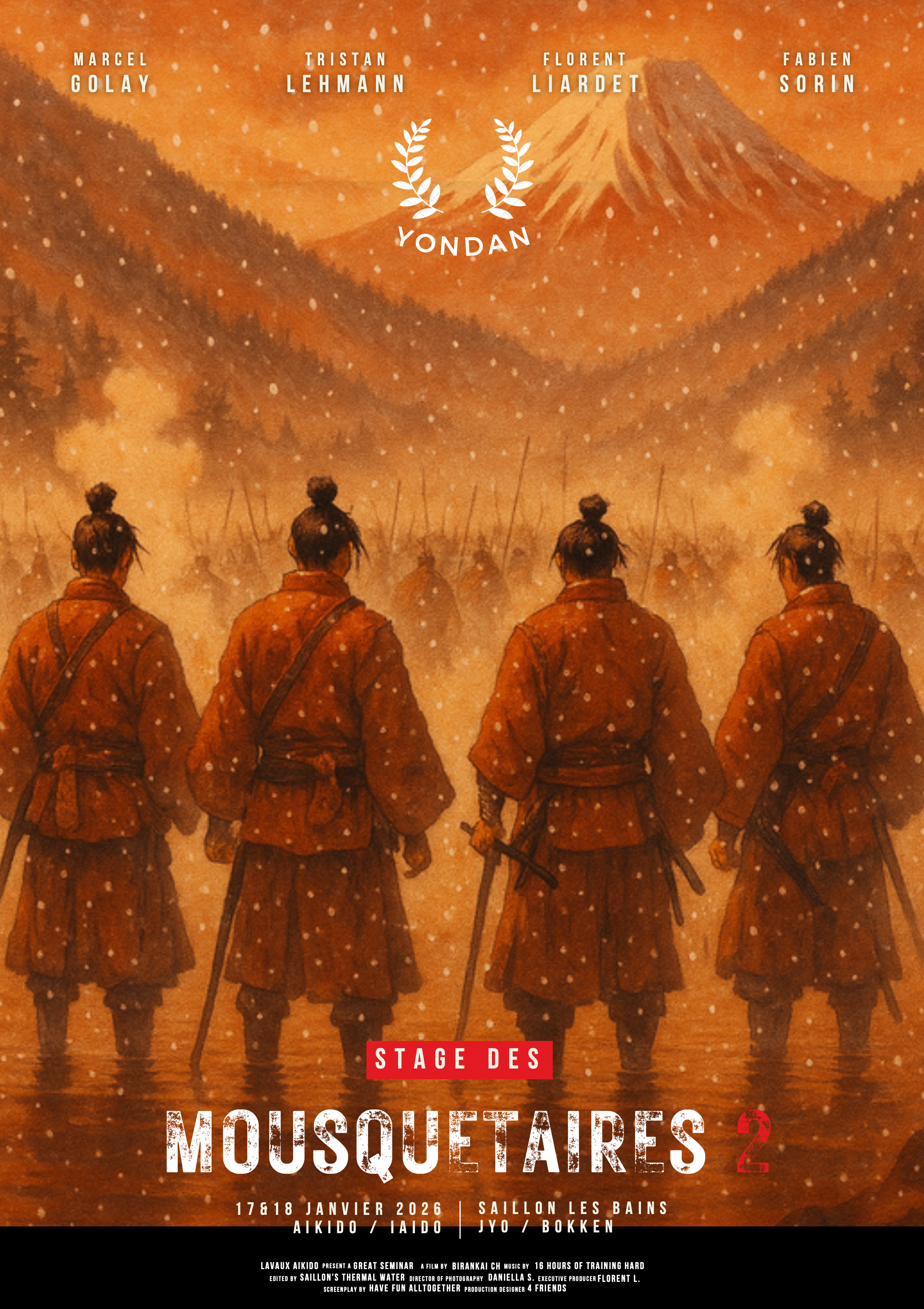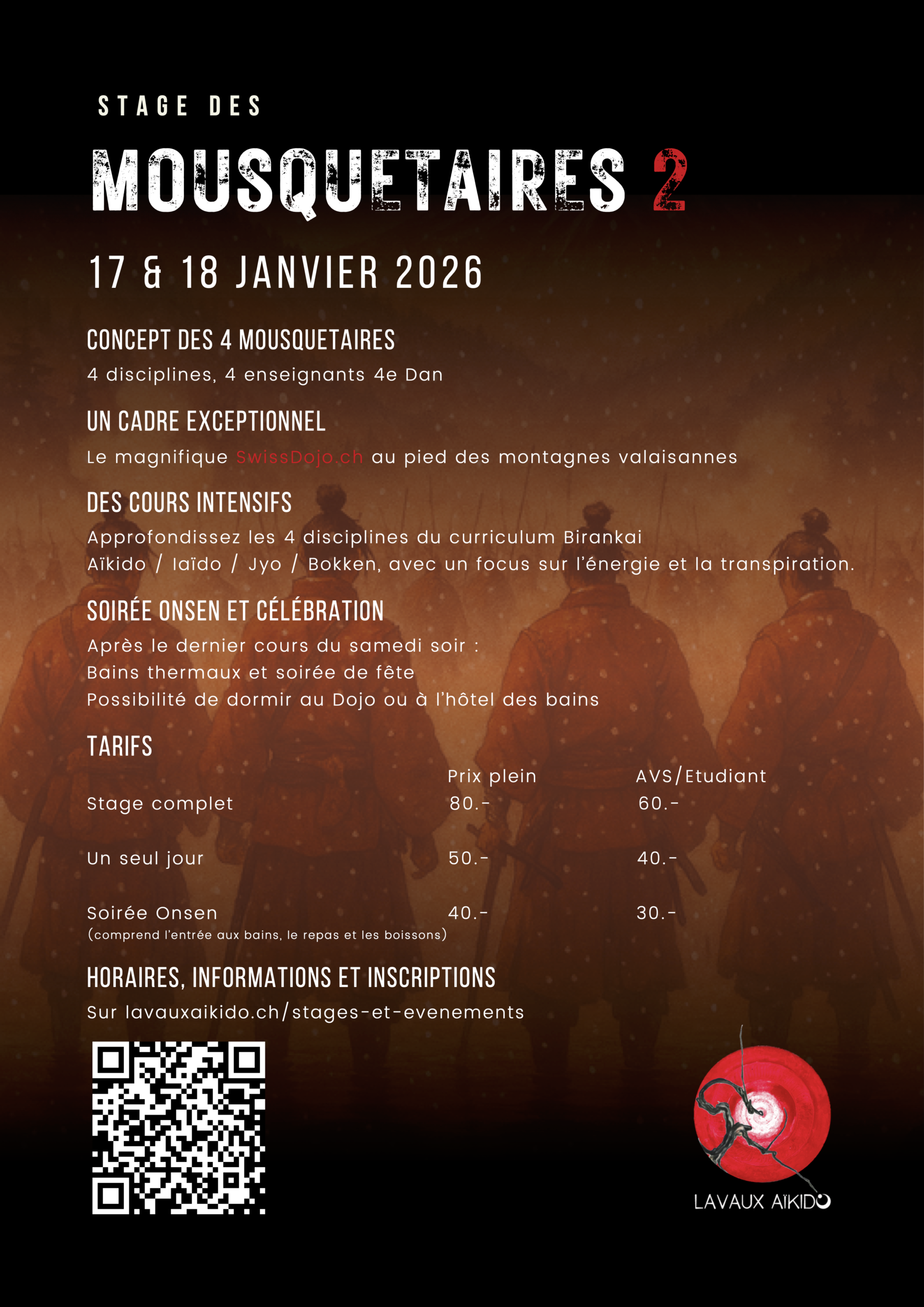 Concept des 4 mousquetaires: 4 enseignants 4e Dan, donnant chacun 4 cours de 4 disciplines Un cadre exceptionnel: le magnifique SwissDojo.ch au pied des montagnes valaisannes 16 Cours intensifs: Approfondissez les 4 disciplines du curriculum Birankai Aïkido / Iaïdo / Jyo / Bokken Soirée Onsen et Célébration Après le dernier cours du samedi soir: Bains thermaux et soirée de fête Possibilité de dormir au Dojo ou à l’hôtel des bains Ici: Flyer Information et inscription